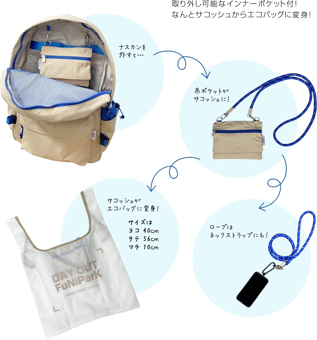 便利なサブバッグ(サコッシュ&エコバッグ一体型)やレジャーシートなども内蔵。