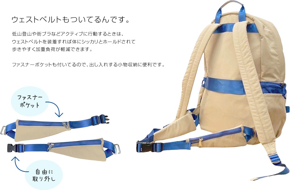 ピクニック、旅行、低山トレッキングなどのお出かけに、子育てするママやパパも毎日使える。
